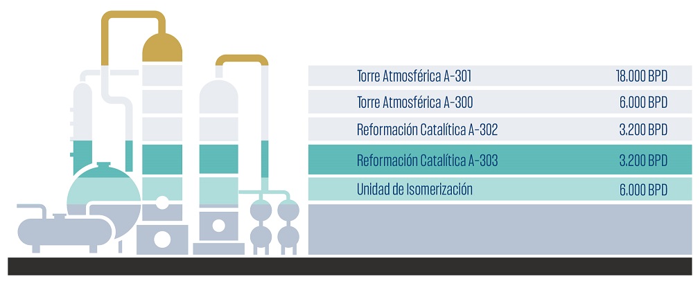 Con una capacidad de procesamiento de 24.000 barriles de petróleo crudo por día (BPD), la Refinería Guillermo Elder Bell está conformada por las unidades de crudo del Área 301 y el Área 300, y dos plantas de Reformación Catalítica que procesan un total de 6.400 BPD.